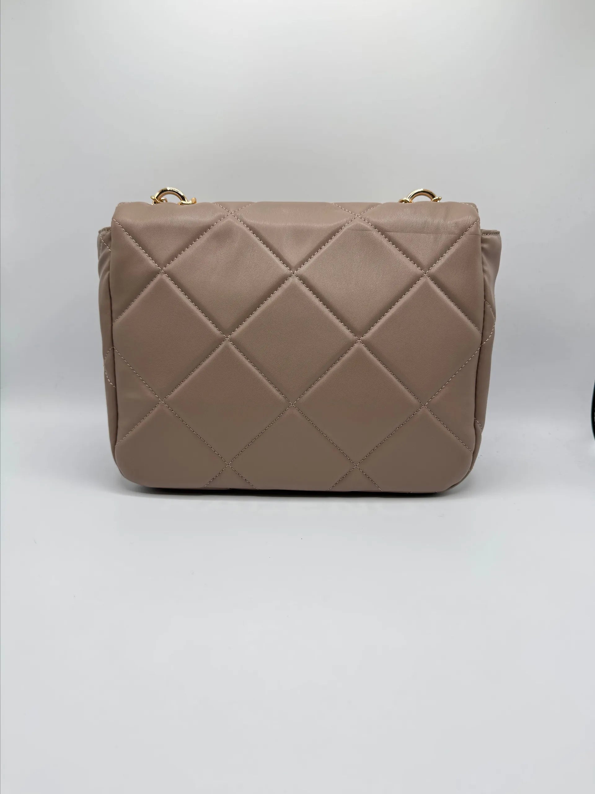 Buttery soft vegan leather diamond quilted crossbody designer bag in a gorgeous taupe color with gold hardware. (BM-4175)