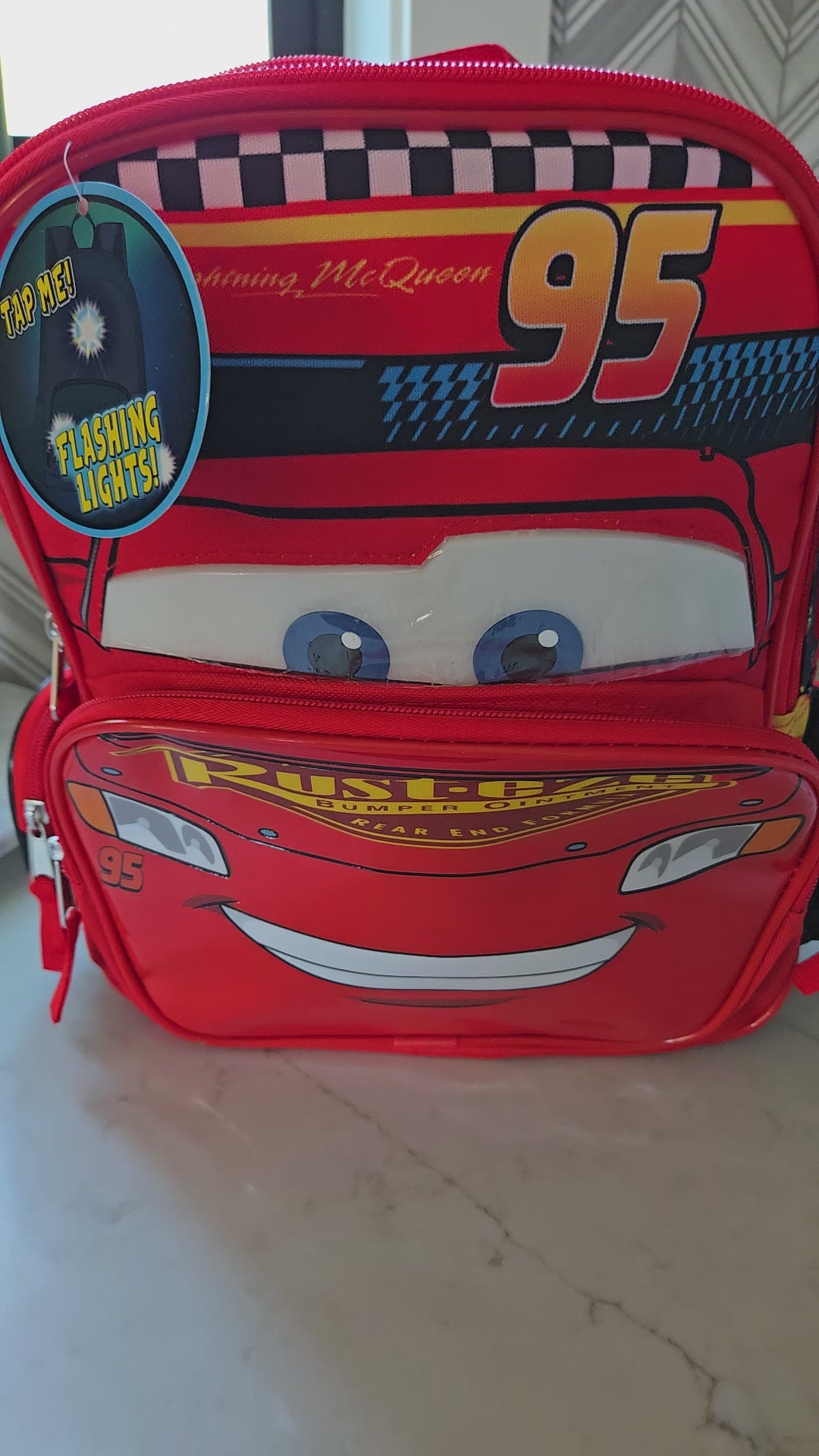 Be the ultimate "Cars" fan with our Disney Pixar Cars Nylon Light-Up Mini Backpack! Featuring your favorite character Lightening McQueen, this backpack is made of durable nylon material and even has a light-up feature for added fun. Perfect for all your mini adventures!