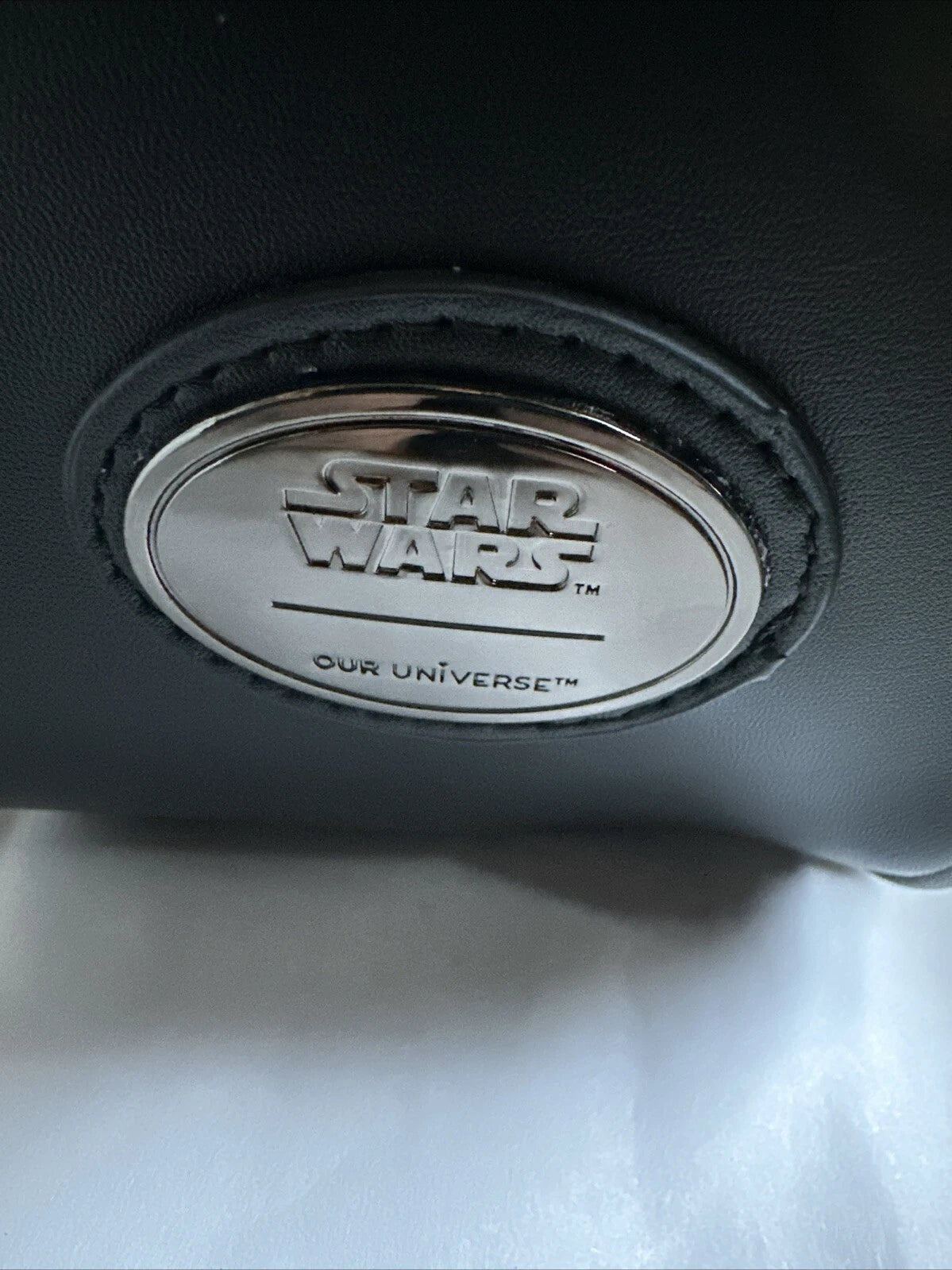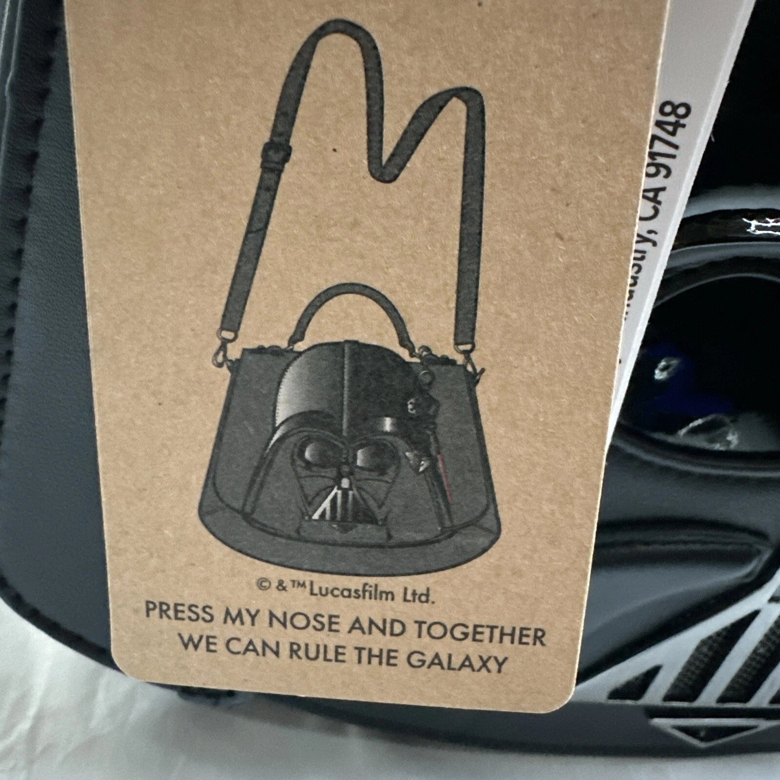 Patent leather helmet, super soft vegan leather body, exterior pocket for your phone, crossbody strap and/or handle as well as the amazing official Darth Vader sound when you push in his nose.